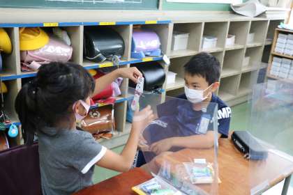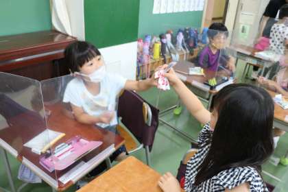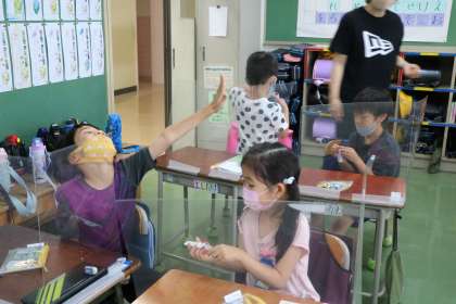1年生算数の様子です。足し算カードを使って友達どうしで問題を出し合いながら習熟を深めます。ミニ先生ぶりがかわいいです。