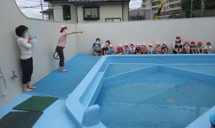プールサイドに集まって、プール開きを行いました。楽しく安全に遊べるよう、プールでの約束を絵表示を使いながらみんなで確認。プール遊びの日が楽しみですね。