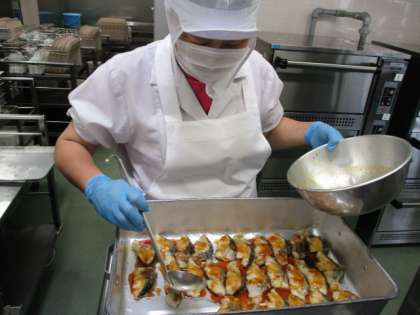 梅の実がなるころに合わせて、梅を使った献立です。片栗粉をつけて揚げ焼きにした白身の魚の上に、梅を使ったたれをかけました。梅だれの材料は練り梅、みりん、しょうゆ、さとう、鰹節からとっただし汁です。さっぱりとしておいしいたれです。写真は魚の上に梅だれをかけているところです。