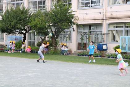 朝遊びが終わり、一輪車をしまおうとしている1年生がいました。竹馬で遊び終わって教室に戻ろうとしていた4年生が