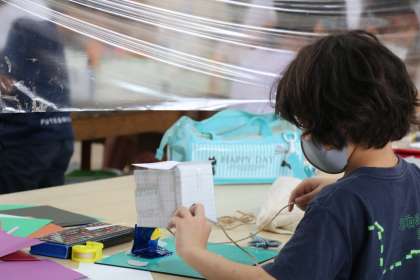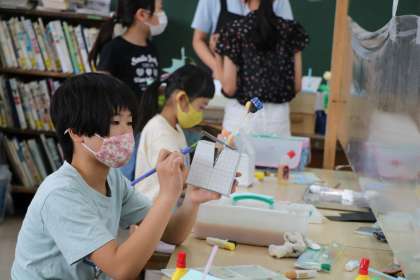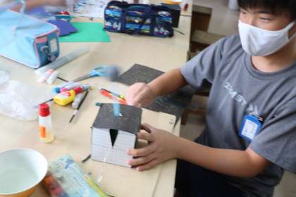 スィングボックスには、色画用紙を貼ったり、色を塗ったり、絵を描いたり、やり方それぞれ選んでいいのだそうです。個性が出て、見ている方も楽しいです。