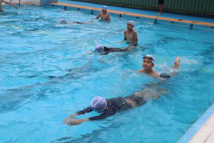 6年生体育水泳学習の様子です。バディーのペアどうしアドバイスをしながら学習しています。以前なら友達の前側に来て、アドバイスをしていましたが、今年度は距離を取るため、後ろ側からアドバイスをします。