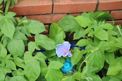 1年生が「校長先生!大変大変!!」と知らせに来てくれました。何事かと行くとなんと!「まだ支柱を立てていないのにアサガオの花が咲いているの!窮屈そうでかわいそう。」と言うのです。