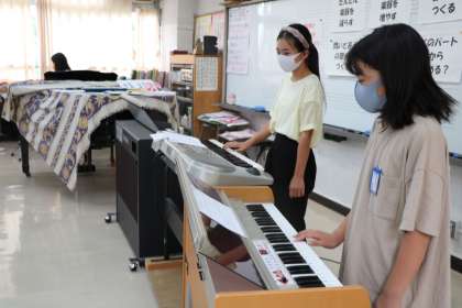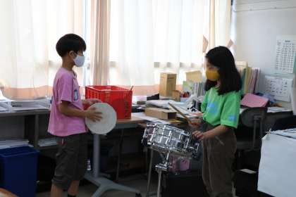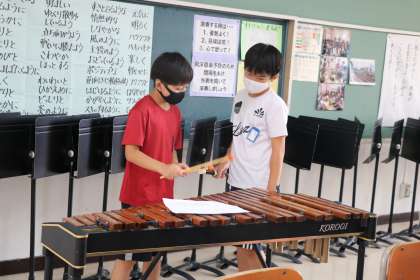 5年生音楽の学習です。「リボンのおどり」という曲について、音の重ね方についてグループ毎に相談して決めている様子です。曲全体のまとまりを考えて工夫していくために、いろいろな方法を先生から教わりました。どのパートから始めるか?楽器はだんだん減らしていく方がいいか増やしていく方がいいか?繰り返しの部分を作ろうか?相談は今日までです。発表会目指して子どもたちは真剣です。
