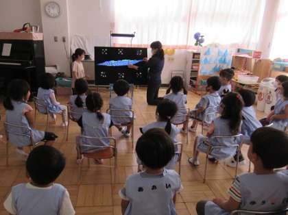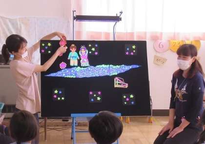 七夕の日に向けて飾りを作りはじめています。そこで今日は、みんなで“七夕さまのおはなし”のパネルシアターを見ました。ブラックライトで光るブラックシアターを使ったので、「映画みたい」「光ってきれい!」と喜んで見ていました。