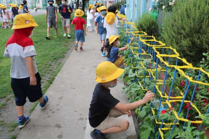 今日は幼稚園門で子供たちを迎えます。8時5分のチャイムまで昇降口で待っていますが、手遊びをしたり、おしゃべりをしたり、上手に並んで友達と過ごしています。