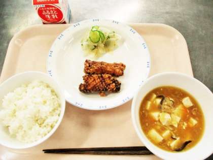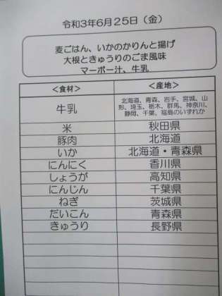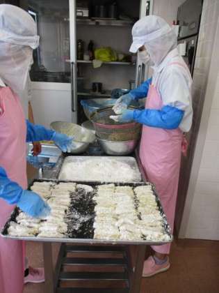 「いかのかりんとあげ」はしょうゆとみりんで下味をつけたいかに片栗粉をつけて油で揚げて作りました。写真はいかに片栗粉をつけているところです。よくかんで食べることは体にとってよい働きがたくさんあります。かむ力は毎日の食事を通して身につけるものです。食べ物を少し大きめに切って料理に入れたり、いかなどのかみごたえのある食品を使ったりして日頃からよくかんで食べるようにしたいですね。