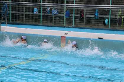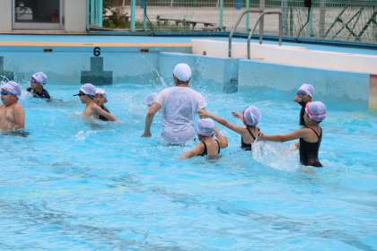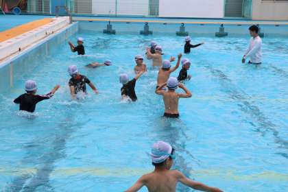 1年生体育・水泳学習の様子です。水の中を歩いたり、足で水しぶきをたくさん作ったり、ゾウになって水を手でかきあげたり、水と仲よしになりましょう。