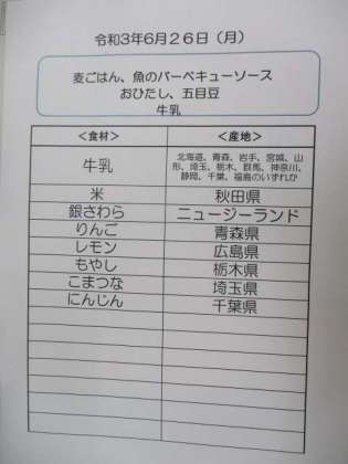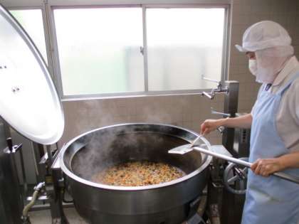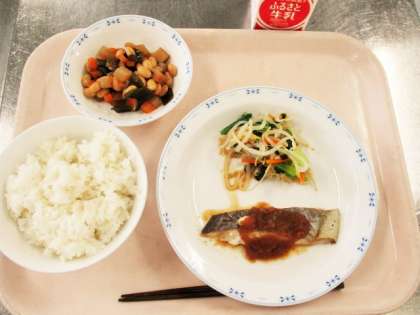 給食では魚料理のバリエーションがたくさんあります。今日は焼いた魚にバーベキューソースをかけました。バーベキューソースはすりおろしたりんごと酒、みりん、しょうゆ、酢、さとう、レモン汁、唐辛子を合わせて加熱して作ります。酸味と甘みのバランスがよく、食がすすみます。写真は五目豆を煮ているところです。ゆっくりコトコト時間をかけて味をふくませています。