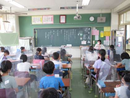 月曜の全校朝会もそれぞれの教室から参加。静かに話を聞いています。