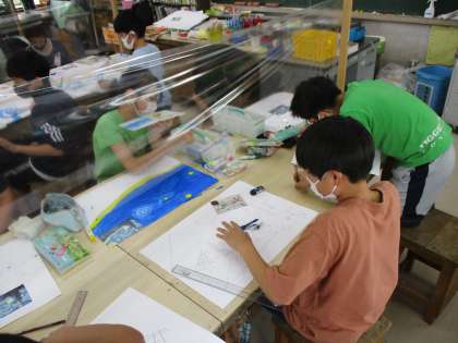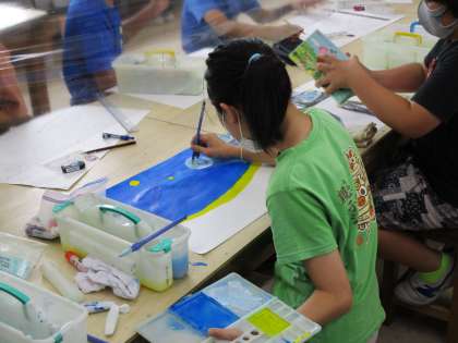 6年生図工「名画とコラボ」制作の様子です。名画3枚の中から好きな名画を選び、画用紙の中にその絵を配置し、続きを描いていくという何とも楽しそうな作品です。