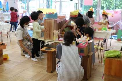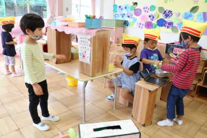 帽子をかぶった店員さんがお店屋さんで遊んでいる年少の教室です。