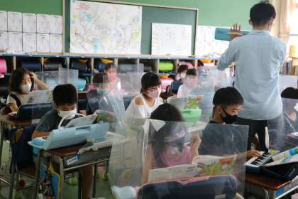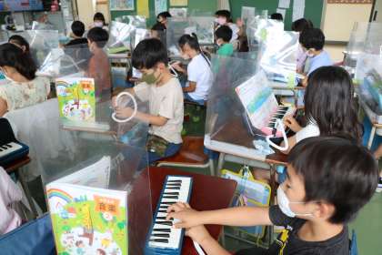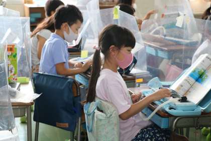 2年生音楽の様子です。鍵盤のハーモニカの指使いを確認しながら練習しています。