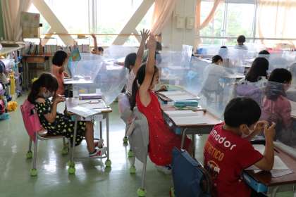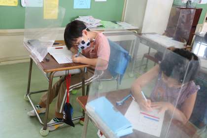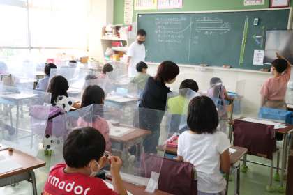 2年生算数の様子です。線分図を用いて、問題からわかっていることと問われていることを整理していき、式を求める学習です。高学年になっても使う大切な学習です。今日は机間指導をしている先生のもっているペンは銀色だとか。みんな銀の丸を楽しみに一生懸命ノートをとり式を立てています。