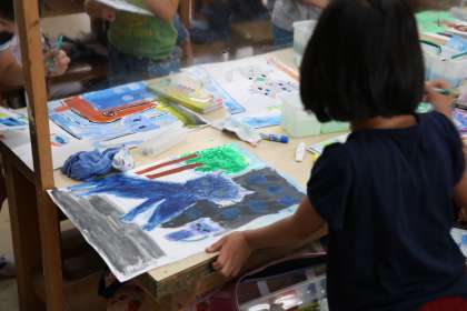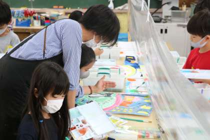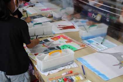 3年生図工「ねこのさんぽ」制作の様子です。都会に住む猫を想像してクレパスで猫を描き、今日は周りの背景を絵の具で描きます。都会の街並みの様子をどのように表現するのでしょうか。完成が楽しみです。