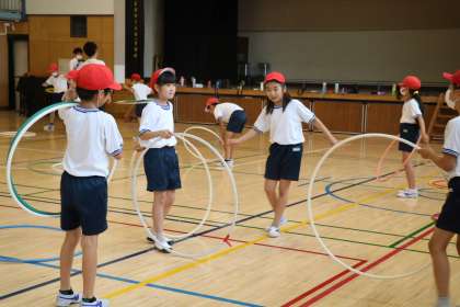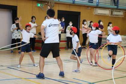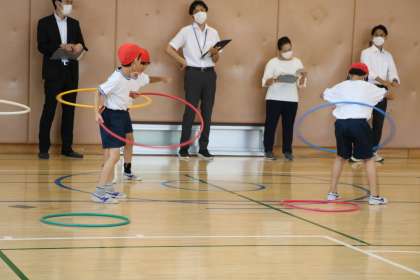 講師に来ていただいた大学の先生をはじめたくさんの先生方が見守る中、たっぷり体を動かし、友だちと関わりながら色々な運動に挑戦します。