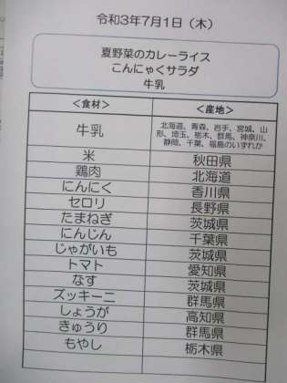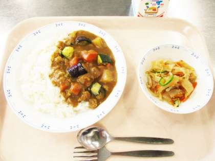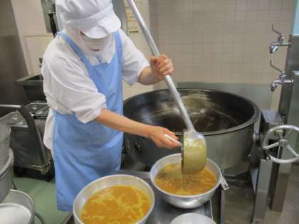 今日のカレーライスは、夏野菜をたっぷり使った「夏野菜カレー」です。なす、ズッキーニは一度油であげています。トマトもたっぷり入っています。給食のカレーは、ルウも手作りしています。写真はカレーのルウができあがったところです。