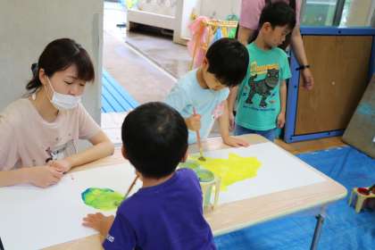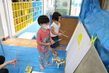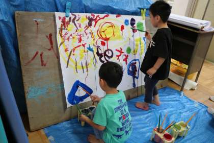 年少さんは遊びと並行して、水彩絵の具でダイナミックなお絵かきです。どんな作品になるでしょうか。楽しみです。