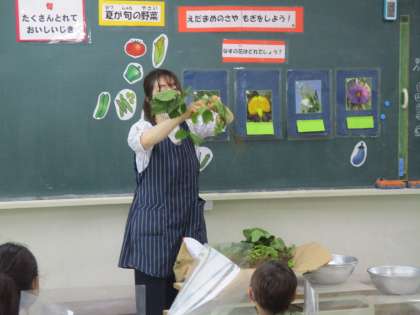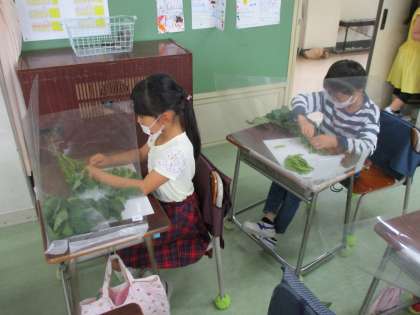 1時間目は2年生が枝豆のさやもぎ体験です。栄養士の先生にから枝豆についてのお話を聞き、さやもぎのやり方を聞き、さあ始め!力がいるので一生懸命がんばりました。