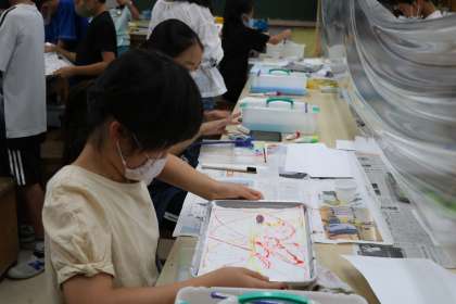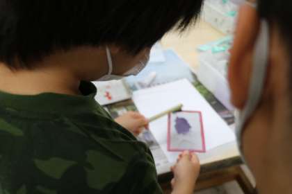 4年生図工の様子です。いろいろな技法を試してみるのが今日のめあてです。真っ白い画用紙がすてきな模様の紙になっていきます。