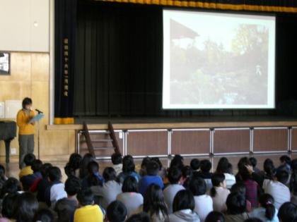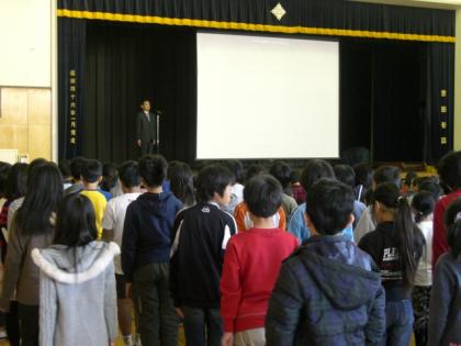 12月最初の全校朝会がありました。校長先生から「12月は、2学期のまとめの時期として、寒さに負けずに頑張ってください」とのお話がありました。また、オーストリアに世田谷区の海外派遣団の一員として参加したお友達からの報告がありました。