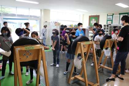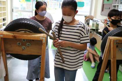 毎週日曜日の午前中は、盆踊り大会の太鼓隊が練習を重ねています。今週まではタイヤを太鼓に見立てて練習し、来週からは音楽室で本当の太鼓を使って練習します。