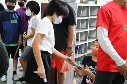 太鼓のばちを次の友達に渡すとき、丁寧に消毒をして渡します。感染対策もしっかりしています。