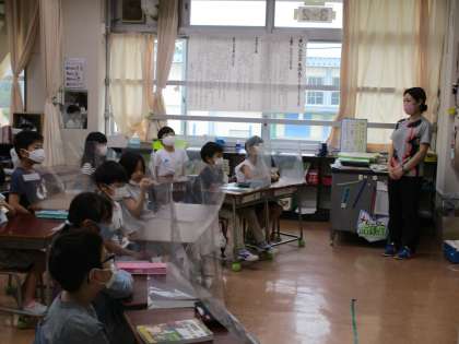 写真は、教室で静かに話を聞く3年生と6年生の様子です。