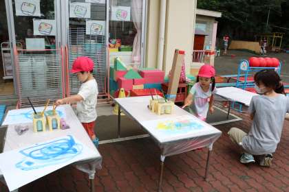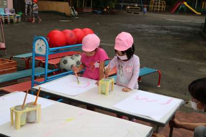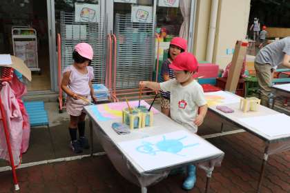 年少さんは、先週の続きで絵の具を使い制作活動にも取り組みます。どんな作品になるのかな?