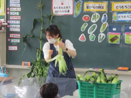 今日は1年生がトウモロコシの皮むきに挑戦しました。