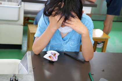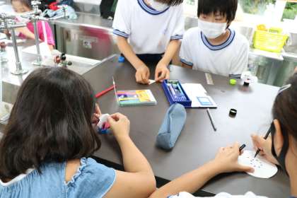 水に先端を付けて色が分かれていくのを見つめています。