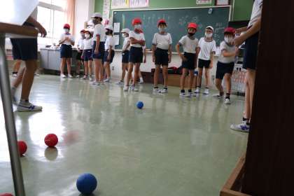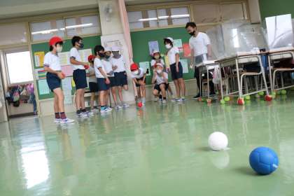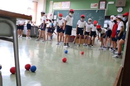 こちらも室内でできる運動を考え、「ボッチャ」に挑戦しています。