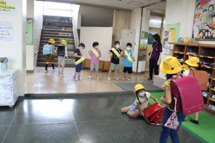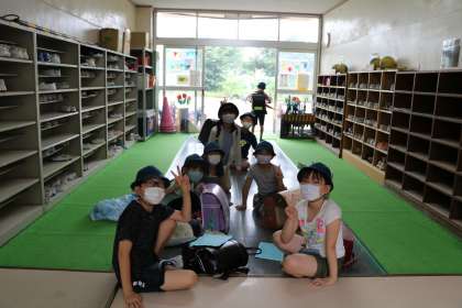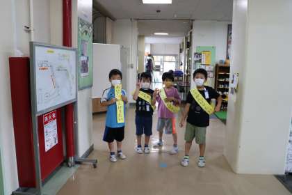 今朝も小雨が降る中の登校です。昇降口には1年生の元気なあいさつ隊が立ち、元気なあいさつの声を響かせています。
