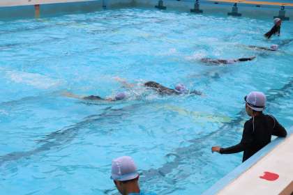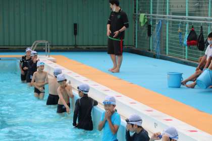 4年生の水泳の授業です。曇っていましたが、気温が高く気持ちよく水泳の授業を楽しむことができました。