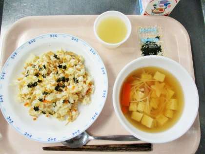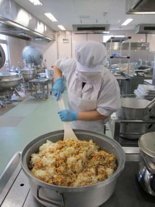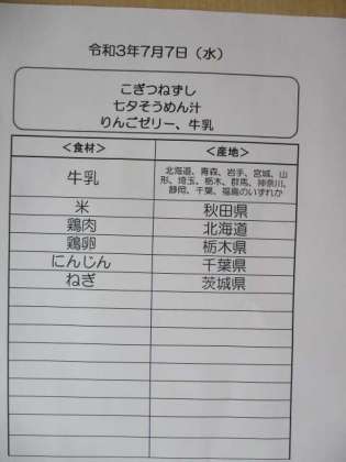 今日は七夕の行事食です。七夕にはそうめんを食べる風習があります。今日はすまし汁の中にそうめんをいれました。星形のかまぼこも入っています。こぎつね寿司は油揚げをつかった具とすめしを合わせたものです。上にかけるきざみのりを星形にしてみました。昨年出したときにもこどもたちは「かわいい!」といいながらご飯の上にかけてくれていました。写真はこぎつね寿司の酢飯と具を混ぜているところです。