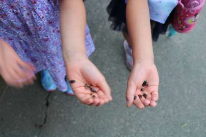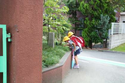 あいさつをしたのに入ってこない子供たち。ダンゴムシに真剣です!