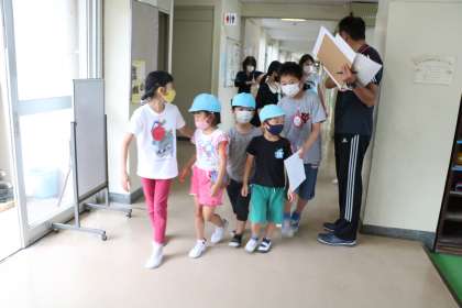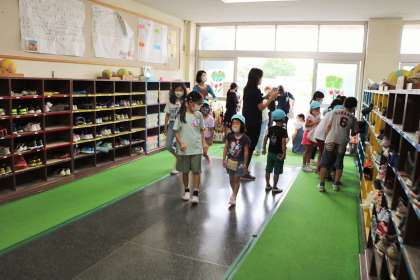 約束の時間に砧幼稚園の年長さんが小学校に到着しました。楽しみに待っていた5年生がお迎えに来て、それぞれの場所に連れて行ってあげます。少し緊張気味の年長さんです。