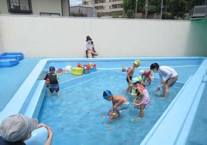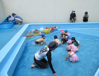 幼稚園で久しぶりにギラギラの太陽を見た気がします。セミも鳴いていました。「気持ちいいね」「やっと入れたね」と喜んでいました。
