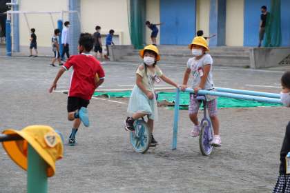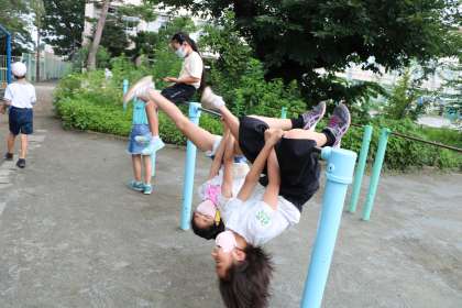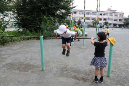 鉄棒もいろいろな技を見せてもらいました。1年生が3年生に「わ〜すごい!どうやるの?」と聞いています。遊びを通して異学年で自然に交流ができるのは、砧小学校の子たちのすてきなところです。