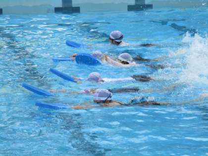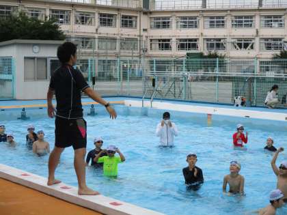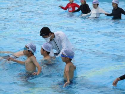 4年生体育・水泳学習の様子です。個別に声をかける時は、先生たちも水泳用のマスクを付けます。今年のプールでは、先生の声しか聞こえない!という約束を子どもたちは一生懸命守っています。
