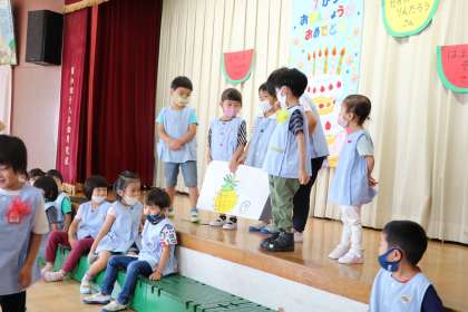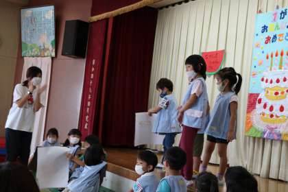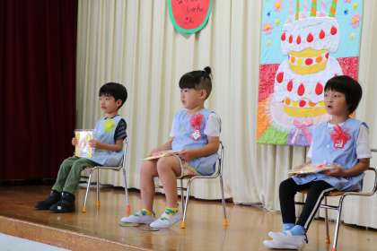 今日は7月の誕生会1組バージョンです。3人のお誕生日の子は緊張と嬉しいのとで、にこにこです。