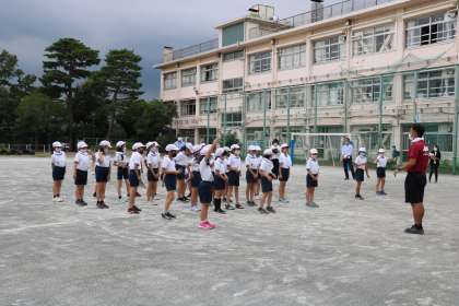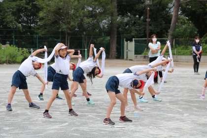 身支度を確認し準備運動が始まります。子供たちと担任との息もぴったりあっている様子に参観している先生たちも笑顔になります。