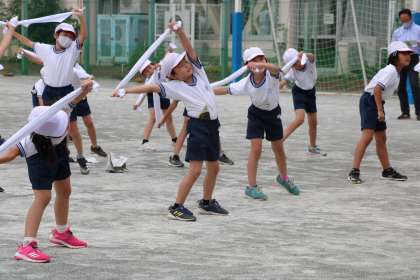 今日は3年生、陸上領域・投の運動「強く!速く!なげなげランド」の学習です。