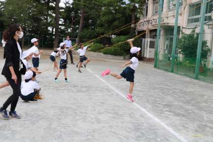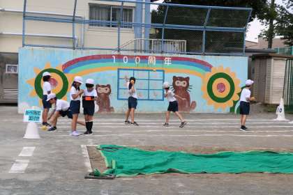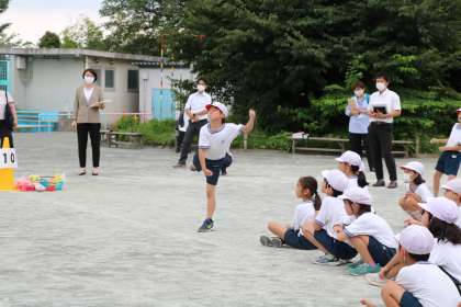 「投げ投げタイム」でグループ毎に自分たちの課題にあった場所で練習している様子です。先生に、こういうところがいいよと具体的にほめてもらえるので、子供たちはますますがんばります。