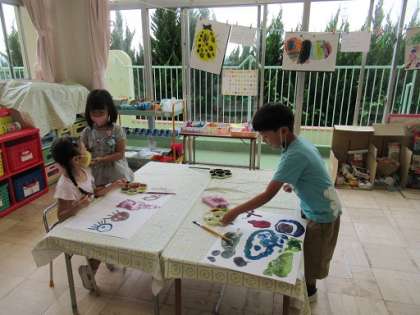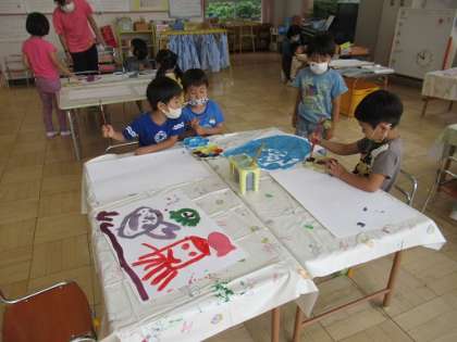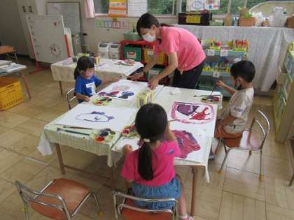 海の生き物の絵に取り組んでいます。絵の具で混色を楽しみながら描いていました。