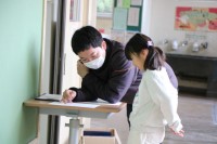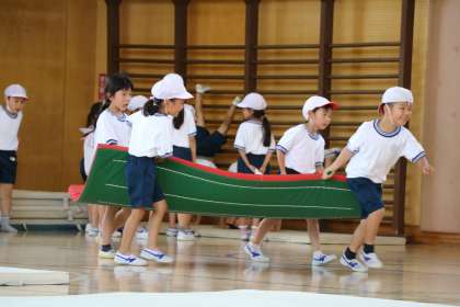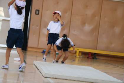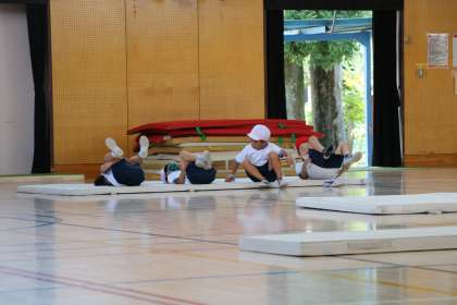 1年生体育マット運動の様子です。今日は楽しみにしていたマット発表会だそうです。みんなで協力して準備をしたら、まずは自分の練習の時間です。