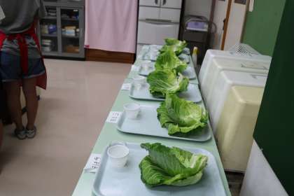 食べられない、キャベツの外葉を給食室からもらってきて、野菜炒めの調理実習です。芯の部分と葉の部分の切り方の違いも実物なら確かめながら包丁で切ることができます。