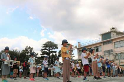 6時間目は6年生鼓笛隊がはじめて校庭で練習をした様子です。