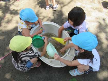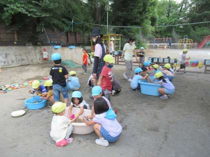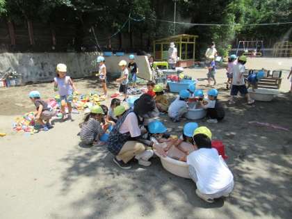 今日は、みんなで大掃除をしました。年長組さんは、幼稚園のみんなのために砂場の遊具もきれいにしてくれました。年長組さんがどんどん洗ってくれたので、たくさんあった砂場の遊具も、あっという間にピカピカになりました。年少組さんに「ありがとう!」と言われて嬉しそうでした。