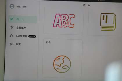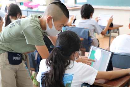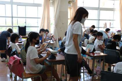 5年生がタブレット端末でキュビナを開き、夏休み中のドリル学習に取り組む準備をしています。